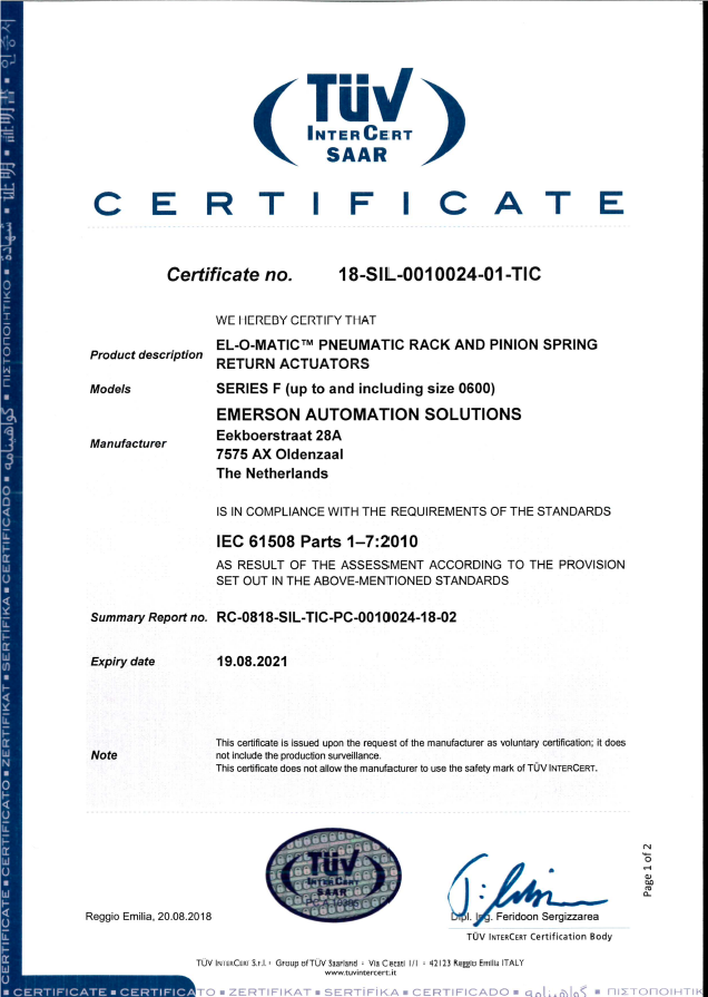 Faultlessly functioning, the first time and every time is related to reliability of the product design. The F Series was designed to meet high reliability requirements like is formalized in the IEC standard IEC 61508-2 (Safety Integrity Levels). As such, the EL-O-Matic F Series are available with a SIL 3 rating approval from TÜV.
